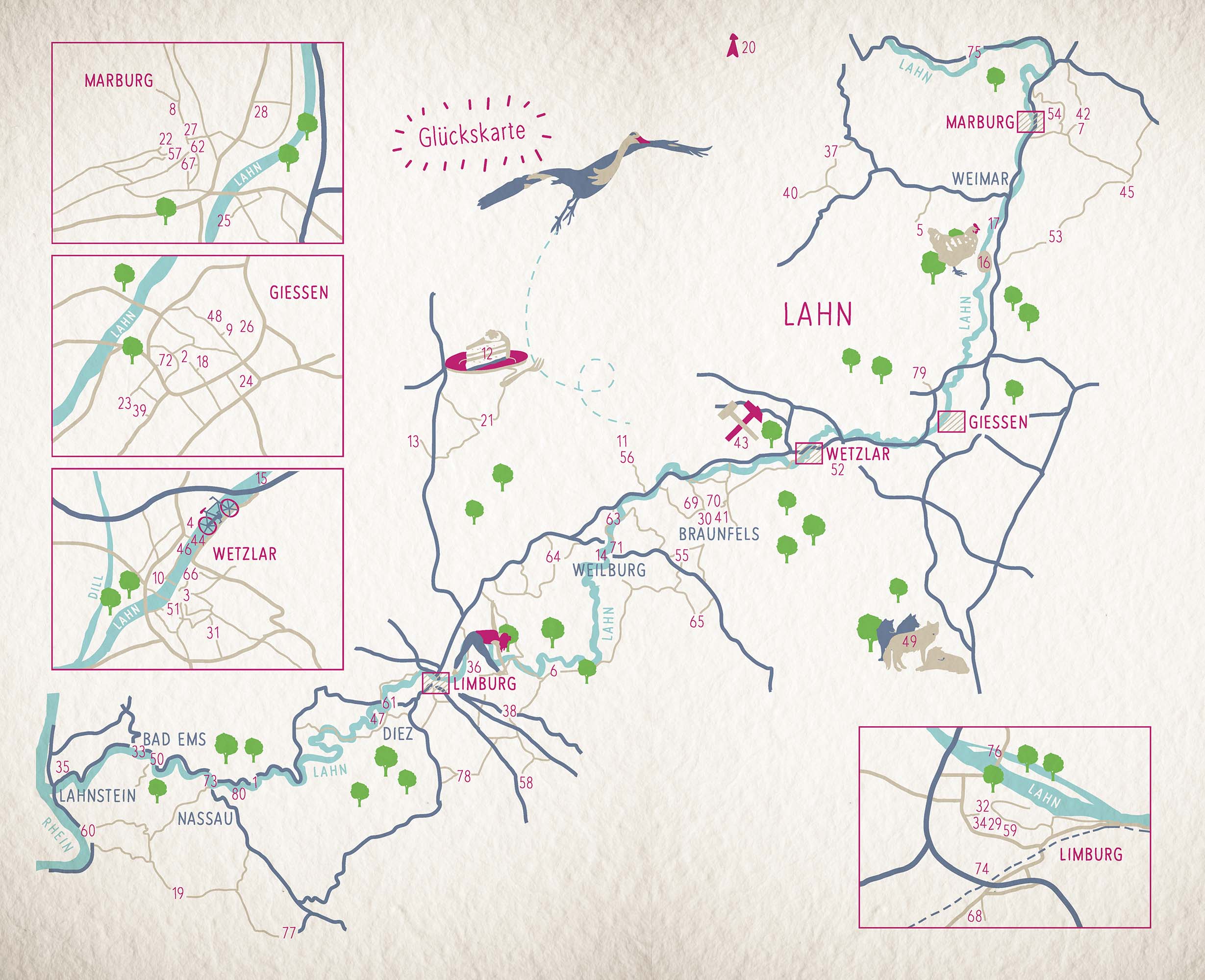 Das Leben ist ein Fluss, und die Lahn ist ein Glück. An ihren Ufern geht das Leben einen gemütlichen Gang und hält eine Vielzahl an zauberhaften Erlebnissen bereit. Vom Gießkannenmuseum über Betonkunst und Wildkräutergarten bis hin zum Kaffeetrinken unterm Zirkuszelt – zwischen Marburg, Gießen, Limburg und Bad Ems gibt es jede Menge zu entdecken. Hier kann man waldbaden und flusswandern, Burgfräulein werden oder schwedische Köstlichkeiten genießen. Welch ein Glück!