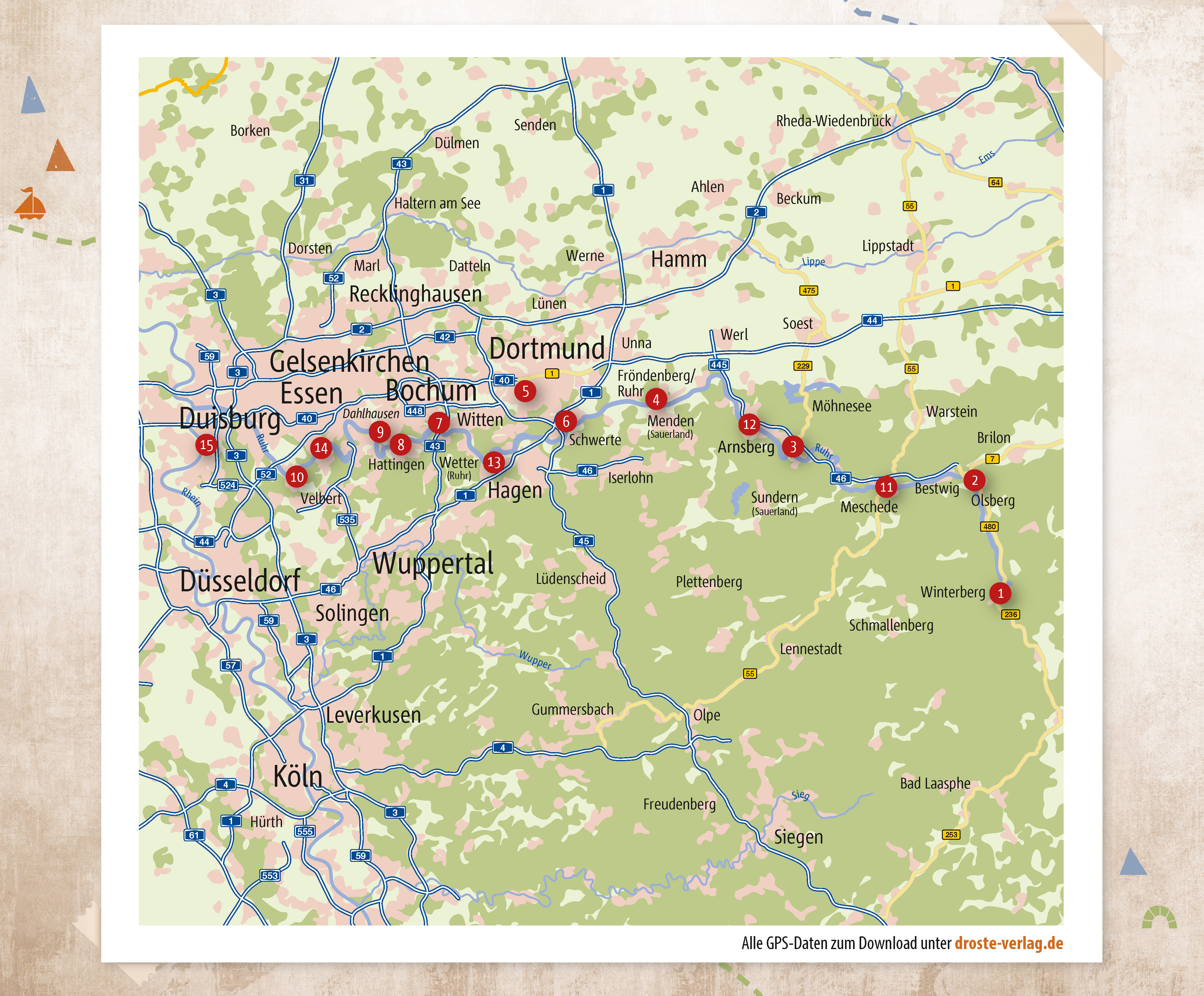 Vom Sauerland bis ins Ruhrgebiet, von waldigen Höhen bis zum Hafen: An den Ufern der Ruhr gibt es viel zu entdecken! Wie ein blaues Band zieht sich der Fluss durch NRW und lädt zu erlebnisreichen Radtouren ein. Rund um die Quelle locken grüne Wiesen und steinerne Riesen zu entspanntem Naturgenuss, nah der Mündung begeistern Industriecharme und urbanes Flair. Dazwischen radelt man über alte Bahntrassen, bestaunt originelle Kunst und findet Erfrischung an Bächen und Seen.