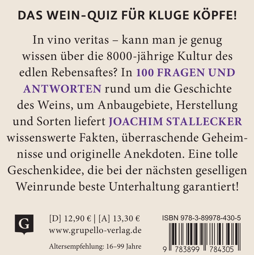 In vino veritas – kann man je genug wissen über die 8.000-jährige Kultur des edlen Rebensaftes? In 100 Fragen und Antworten rund um die Geschichte des Weins, um Anbaugebiete, Herstellung und Sorten liefert Joachim Stallecker wissenswerte Fakten, überraschende Geheimnisse und originelle Anekdoten. Eine tolle Geschenkidee, die bei der nächsten Weinrunde beste Unterhaltung garantiert!
