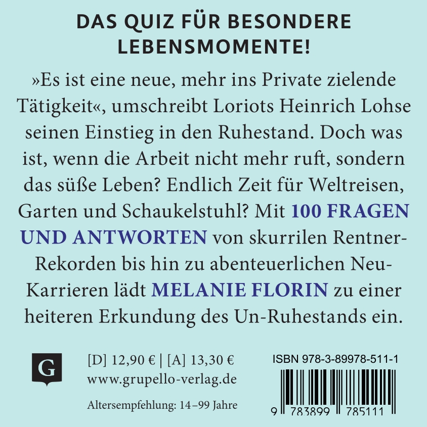 „Es ist eine neue, mehr ins Private zielende Tätigkeit“, umschreibt Loriots frischgebackener Pensionär Heinrich Lohse seinen Einstieg in den Ruhestand. Doch was ist, wenn die Arbeit nicht mehr ruft, sondern das süße Leben? Endlich Zeit für Weltreisen, Garten und Schaukelstuhl? Von skurrilen Rentner-Rekorden bis hin zu abenteuerlichen Neu-Karrieren lädt das Quiz zu einer vergnüglichen Erkundung des Un-Ruhestands ein – mit viel Humor, staunenswerten Fakten und der Gewissheit: Das Beste kommt noch!