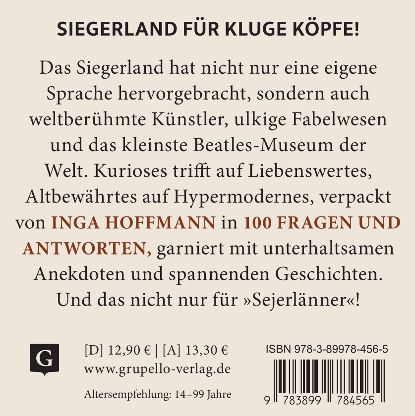 Das Siegerland hat nicht nur eine eigene Sprache hervorgebracht, sondern auch weltberühmte Künstler, ulkige Fabelwesen, Orte mit Kultstatus auf Instagram oder das kleinste Beatles-Museum der Welt. Kurioses trifft auf Liebenswertes, Altbewährtes auf Hypermodernes und ergibt eine unverwechselbare Mischung, verpackt in 100 Fragen und Antworten, garniert mit unterhaltsamen Anekdoten und spannenden Geschichten. Und das nicht nur für „Sejerlänner“!