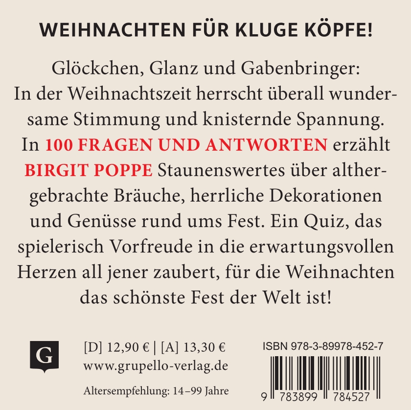 Glöckchen, Glanz und Gabenbringer – O du fröhliche Weihnachtszeit! Vom Ersten Advent bis ins Neue Jahr herrscht überall eine besondere Atmosphäre knisternder Spannung und wundersamer Stimmung. In 100 Fragen und Antworten erzählt Birgit Poppe allerlei Staunenswertes über traditionelle Bräuche, herrliche Dekorationen und besondere Genüsse rund ums Fest und zaubert spielerisch Vorfreude in die erwartungsvollen Herzen all jener, für die Weihnachten das schönste Fest der Welt ist.